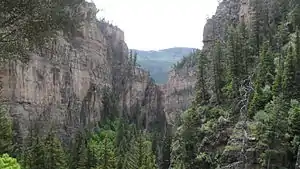 Glenwood Canyon is a rugged scenic 12.5 mi (20 km) canyon in western Colorado in the United States. Its walls climb as high as 1,300 feet (400 m) above the Colorado River. It is the largest such canyon on the Upper Colorado. The canyon, which has historically provided the routes of railroads and highways through western Colorado, currently furnishes the routes of Interstate 70 and the Union Pacific's Central Corridor between Denver and Grand Junction.