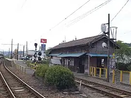 The station has a single island platform connected to a rustic wooden station building by a level crossing. The station is unattended.