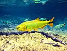 Salminus brasiliensis (dourado, dorado, golden dorado, river tiger or jaw characin) is a large, predatory characiform freshwater fish found in central and east-central South America.[2] Despite having Salminus in its name, the dorado is not related to any species of salmon,[3] nor to the saltwater fish also called dorado. It is very popular among recreational anglers and supports large commercial fisheries.[4]