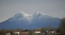 Golden Ears is the name of the double summit that lies north of Maple Ridge, British Columbia and is visible from most of the western Lower Mainland. The mountain is in Golden Ears Provincial Park, and was originally referred to as Golden Eyries,[1][2] possibly for golden eagles that were observed near the summit. There is confusion about the name, because of the twin summits the peak exhibits. Many people believe that the mountain is named because it looks like ears which become golden in the sunset light.