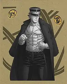 | Sugimoto introduces himself to the large Japanese man from the Stenka audience, Maiharu Gansoku, but they speak no further. Through the tavern owner, the Japanese group is asked to throw the fight to have their dog returned, but they angrily decline. Their main opponent at the second Stenka is their target, the tattooed prisoner Gansoku. The bout begins with Sugimoto taking on Gansoku and ends with only Gansoku and the Japanese standing with Sugimoto punch drunk after suffering too many blows to the head. Suddenly, Sugimoto lands a mighty kick on Gansoku, causing a riot. He chases Gansoku into the woods with a hammer and sickle, but so do Koito, Tsukishima, and Tanigaki who find Gansoku being attacked by a wolverine. They all seek shelter in a hut which turns out to be a stiflingly hot banya.[lower-alpha 3] Meanwhile, Cikapasi and Enonoka rescue their dog, but attract the attention of the wolverine. Sugimoto arrives to finish the fight with Gansoku, but with Tanigaki's help, Cikapasi shoots the wolverine. This activity causes the men all fall through the ice into the freezing water and they return to the banya with Sugimoto. The icy water returns Sugimoto to consciousness and they decide not to kill Gansoku, but instead copy his tattoos and suggest he seek refuge further into Russian territory. Epilogue: Asirpa is seen seal hunting with Kiroranke, Shiraishi and Ogata. | |||||||