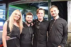 The Romanian Television (TVR) opened a submission period for artists and composers to submit their entries between 15 November and 15 December 2017 to the Selecția Națională, during which 72 entries were received.[25][26] All entrants got to participate in auditions on 19 and 20 December — which were broadcast in January 2018 on TVR1[25][27] — in front of a jury made up of five music industry professionals.[28] 60 songs qualified for the five semi-finals — 12 for each semi-final — which took place throughout January and February 2018. The top three acts selected by the jury from each semi-final qualified for the final held on 25 February 2018, which encompassed 15 finalists.[29] The winner was then determined by televoting.[30] The Humans auditioned their song during the live audition round of the Selecția Națională,[31] qualifying for the fifth and last semi-final on 18 February 2018. In the semi-final, they performed tenth and placed first with 58 points (with four jurors awarding them the maximum of 12 points), qualifying for the final.[32] The group performed last in the final round on 25 February 2018;[33] lead singer Caramarcu wore a red dress hand-sewed by Romanian designer Andreea Zamfir.[5] The Humans ultimately won the Selecția Națională, gathering 3,277 audience votes.[34]