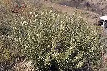 Goodenia chambersii is an ascending shrub that typically grows to a height of 50 cm (20 in) and has somewhat sticky foliage. The leaves are broadly egg-shaped to round, toothed, 15–30 mm (0.59–1.18 in) long and 10–30 mm (0.39–1.18 in) wide on a petiole up to 15 mm (0.59 in) long. The flowers are arranged in racemes or thyrses up to 200 mm (7.9 in) long on a peduncle 2–5 mm (0.079–0.197 in) long with linear bracteoles 5–7 mm (0.20–0.28 in) long at the base, each flower on a pedicel 5–10 mm (0.20–0.39 in) long. The sepals are lance-shaped, 5–6 mm (0.20–0.24 in) long and the petals are yellow and 18–25 mm (0.71–0.98 in) long. The lower lobes of the corolla are about 10 mm (0.39 in) long with wings about 1.5 mm (0.059 in) wide. Flowering occurs from September to October and the fruit is an oval capsule about 12 mm (0.47 in) long.[2][3]