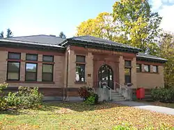 The Gordon-Nash Library is located in the village center of New Hampton, on the south side of Main Street opposite the New Hampton School. The building consists of the original 1895 building, to which several additions have been made to the rear. The original building is a single-story masonry structure, built out of gold-colored bricks and covered by a hip roof. It has a three-part front facade, whose defining element is a central projecting hip-roof section. It has a central arched entrance, with a brownstone surround including pilasters and an entablature above the keystoned arch. The outer left section has three sash windows sharing a brownstone lintel, which are separated from transom-like windows by a similar header. The outer right section only has square windows in the transom positions.[3]