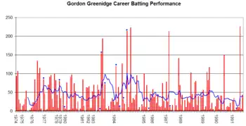 Gordon Greenidge and Desmond Haynes formed a prolific opening partnership, first playing a test match together in 1978.[22] The pair made 6,482 runs while batting together in partnerships, the third highest total for a batting partnership in Test cricket history as of 2019.[23] Desmond Haynes said of Greenidge: "Our opening partnership broke records, but Gordon was the better player. His technique was super, especially against spin".[24] They enjoyed 16 century opening partnerships in test matches.[25] They also had success in one day cricket with their batting partnerships yielding 5,150 runs at an average of 52.55.[26]