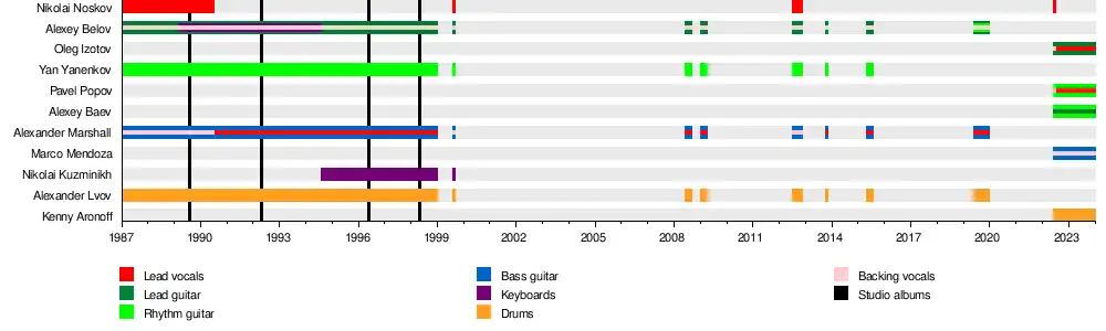 - Alexey Belov – lead guitar, backing vocals (1987—1998; 1999, 2008, 2009, 2012, 2013, 2015, 2019), keyboards (1989—1994), rhythm guitar (2019)