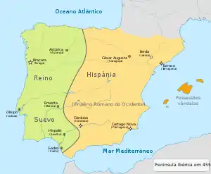 After the murder of Aetius and the emperors Valentinian III and Petronius Maximus in 455, Rechiar no longer felt bound by this and resumed his attempt to conquer all of Spain on the Romans. According to Jordanes, based on his relationship with the Visigothic king and Roman foederatus Theodoric II (his brother-in-law), he had 'the suspicion' that he could rule all over Hispania.