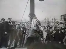 Once local press reported news of the attempt on the president's life, a crowd began to gather at the Plaza Murillo which soon swelled to some 80,000 people.[14] Eventually, rumors that the incident had been a conspiracy by the RADEPA and MNR to regain power caused the crowd to grow agitated leading to a mob forcing their way into the prison. Oblitas was dragged out of his cell and into the plaza where he was shot dead by Carlos Meyer before being hung on one of the lampposts in a manner similar to the fates suffered by Villarroel and others just months prior.[13] Unsatisfied, the mob then turned their attention to Captain José Escobar and Major Jorge Eguino who were also imprisoned in the panopticon awaiting trial for their role in the 1944 Chuspipata massacre during the Villarroel regime.[15][16] Eguino and Escobar, who at the time was with his six-year-old son, were beaten and dragged to the Plaza Murillo. Escobar, who at that point was already dead or dying, was the first of the two to be hanged. Eguino, however, first requested a Confessor, a Coca-Cola,[14] and time to make denunciations. The first two requests, but not the third, were granted and Eguino was then also hanged. However, when the rope was cut it was found that Eguino was still alive and he was instead shot twice before his corpse was re-hoisted onto another lamppost.[13]