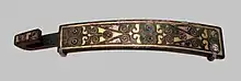 The Minister of the Guards (Weiwei 衛尉) was also known as Commandant of the Guards), and briefly as the Prefect of the Palace Grandees (Zhong da fuling 中大夫令) during Emperor Jing of Han's reign (r. 157–141 BC) before reverting to the original title. This Minister was responsible for securing and patrolling the walls, towers, and gates of the imperial palaces.[83] The duties of his ministry were carried out by prefects, one of whom controlled the gates where nominees for office were received and officials sent memorials to the throne.[84] To control and monitor the flow of traffic through the palace gates, the prefects used a complex passport system involving wooden and metal tallies. During an emergency, the tallies were collected and no-one was allowed to enter unless they breached the gates by force.[85] The guards were conscripted peasants who served for a year's term as soldiers and were invited to attend a celebratory feast hosted by the emperor before demobilization.[86]