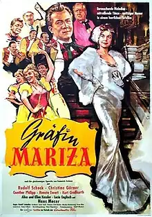 Gräfin Mariza is a 1958 West German musical film directed by Rudolf Schündler and starring Rudolf Schock, Christine Görner, and Gunther Philipp.[1] It is based on the operetta Gräfin Mariza by Emmerich Kálmán, Julius Brammer and Alfred Grünwald. It was shot at the Bendestorf Studios near Hamburg. The film's sets were designed by the art directors Wolf Englert and Ernst Richter.