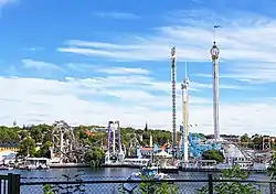 Gröna Lund (Swedish pronunciation: [ɡrøːnaˈlɵnːd]; lit. "Green Grove"), or colloquially Grönan (Swedish pronunciation: [ˈɡrø̂ːnan]), is an amusement park in Stockholm, Sweden. Located on the seaward side of Djurgården Island, it is relatively small compared to other amusement parks, mainly because of its central location, which limits expansion. The 3.8 ha (9.4 acres)[3] amusement park has over 30 attractions and is a popular venue for concerts in the summer. It was founded in 1883 by James Schultheiss.[1]