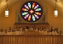 Liturgical music has been key to the worship and fellowship at Grace since the 1850s when the Rev. Rankin organized six African American girls to sing for the congregation. Grace grew so quickly in its foundational years in a town with long-established Presbyterians, Catholics, and Methodists, partly because of the hymns and chants offered in the Episcopal services. The first choirmaster was Johannes Oertel, nationally renowned painter and Episcopal priest, who was also the first to be married in the parish in 1851. In 1906, the chancel was enlarged and an organ was installed to accommodate a new men and boys choir.[3] It was at this point that the choir ranks and system of promotion and honors (choir crosses and ribbons) was introduced –and which remains. In 1936, Harry Rowe Shelley, an organist and composer at several well-known New York City congregations, retired to Grace Madison and took over the choir until the 1950s. The choirs became well known in the area and were annually asked to sing at the local Scribner and Vanderbilt-Twombly estates, where they were also treated to lavish dinners. In 1959, the Tellers Organ Company built the current organ under the supervision of Helen Thomas, the founder, and director of the Grace Church School Choir. A professional soprano soloist, Thomas also founded the Grace Church Sunday School and later became the full music director of the parish in 1969. In her service of over 50 years, Thomas shaped Grace's life into much as how it continues today. She played the organ for the parish until she died in 2006.[4]