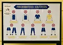 Inside the main hall (throne room), situated at the very centre of the Chakri Maha Prasat Hall, is the Bhudthan Thom Throne (พระที่นั่งพุดตานถม; RTGS: Phuttan Thom), a chair on a raised platform. The Throne is flanked by two seven-tiered umbrellas, while the throne itself is topped by a Royal Nine-Tiered Umbrella. Behind the throne is a tapestry depicting a fiery intertwined chakra and trishula, or the 'Chakri', the emblem of the dynasty. The throne has been used by the king during important state occasions, such as the welcoming or accrediting of foreign diplomats and missions. The room itself has also been used by King Rama IX to welcome foreign dignitaries and heads of state, such as Queen Elizabeth II, President Bill Clinton and Pope John Paul II.[72] Recently the King welcomed more than 21 world leaders inside the room during the Asia-Pacific Economic Cooperation (APEC Summit) held in Bangkok in 2003.[70] The wall of the throne room is decorated with four paintings depicting important scenes in the history of Thai foreign relations. On the east wall hang two paintings, titled 'Queen Victoria receiving King Mongkut's Ambassador' and 'King Louis XIV receiving the Ambassador of King Narai of Ayutthaya in the Hall of Mirrors at Versailles'. On the west wall hang 'King Mongkut receiving British Envoy Sir John Bowring' and 'Napoleon III receiving the Siamese Ambassadors at Fontainbleau'.[73][74]