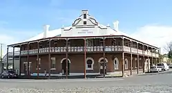The building is a good example of an Edwardian pub having unusual key hole form windows and pictorial leadlight glazing. The dominant architectural features include the well designed two storey verandah with cast iron balustrading and valance work and the massive stuccoed central parapet.[12][1]