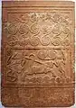 - Stele I, or the "Simile" stele, consists of a central scene framed by two columns of spiral motifs. The center depicts a man in a chariot directing a horse running over a man, possibly armored, lying down. Below the chariot scene, a lion is depicted chasing a quadruped animal.