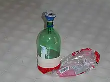 The cap is then packed with a smokable substance and screwed onto the bottle once it is immersed to its neck in liquid. While lighting the bowl with (preferably) a lighter or match, the bottle is gradually lifted until it is about to come out of the water or when the substance ceases burning. While the bottle is held in place, the lid is removed, the user's mouth is placed on the bottle opening, and the user inhales as the bottle is pushed back down into the water.[1][2] The cause of the smoke being expelled by the bottle's movement is the rise in internal pressure, created when the water volume increases; the smoke enters the lungs in a "smoother" manner than inhaling from a joint, blunt, or bowl by itself.[2][3] This will give the smoker a sudden dose with hardly any smoke lost, rather than the amount of smoke lost with joints and blunts.[4] However, once it is burnt and raised, the smoke can simply be breathed in while suspended in the chamber, with returning the bottle into the water to create additional upward pressure during inhalation essentially a matter of preference.