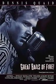 Great Balls of Fire! is a 1989 American biographical drama film directed by Jim McBride and starring Dennis Quaid as rockabilly pioneer Jerry Lee Lewis. Based on a biography by Myra Lewis and Murray M. Silver Jr., the screenplay is written by McBride and Jack Baran. The film is produced by Adam Fields, with executive producers credited as Michael Grais, Mark Victor, and Art Levinson.[3]