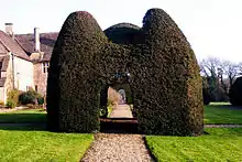 Externally there is a garden with four "tree houses", groups of four clipped yews that have grown together and been hollowed out inside to allow one to walk through.