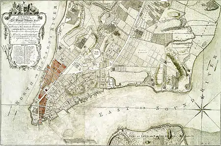 The Great Fire of New York was a devastating fire that burned through the night of September 20, 1776, and into the morning of September 21, on the West Side of what then constituted New York City at the southern end of the island of Manhattan.[3] It broke out in the early days of the military occupation of the city by British forces during the American Revolutionary War.