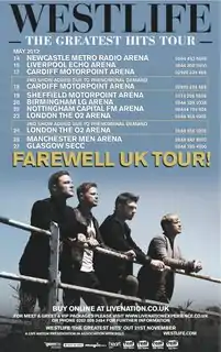 The Greatest Hits Tour (also known as The Farewell Tour)[1] was the twelfth concert tour by Irish boy band, Westlife. The tour, visited the Europe and Asia and supported the group's compilation album, Greatest Hits. After the tour finished, the group disbanded after performing for 14 years until their reformation in 2018.[2]