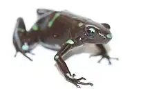 The green-and-black poison dart frog (Dendrobates auratus), also known as the green-and-black poison arrow frog and green poison frog (among others),[1][3] is a brightly-colored member of the order Anura native to southern Central America and Colombia. This species has also been introduced to Oahu, Hawaii in an effort to lower mosquito numbers.[1][3][4] It is one of the most variably colored species of poison dart frogs, after D. tinctorius, Adelphobates galactonotus and some Oophaga species. From a conservation standpoint, it is considered to be of least concern by the International Union for Conservation of Nature. Within the reptile and amphibian hobby, D. auratus remains one of the most commonly kept, and easiest-to-breed, dart frogs in captivity, as well as in zoos.[1]