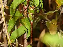 Common green darners are large dragonflies, ranging from 6.8 to 8 centimetres (2.7 to 3.1 in)[13] in length and a wingspan of up to 10 centimetres (3.9 in).[12] Both sexes have an unmarked green thorax. Mature males have bluish-purple abdomens (the first few abdominal segments are the brightest) with a black dorsal stripe that broadens near the end of the abdomen. Immature males and most females have reddish-brown abdomens, but some females are patterned like adult males. Wings are initially clear but usually become amber-tinted with age, especially in females.[12][9] Both sexes have a black ‘bulls-eye’ mark on the face (more precisely, the frons) in front of their eyes, a distinguishing field mark that separates them from the superficially similar comet darner (Anax longipes).[14][12] This species oviposits in tandem which is a unique behavior among North American darners.[14][12]