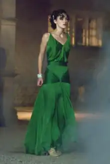 Atonement (2007), a film adaptation of Ian McEwan's novel, centres around the impact of World War II on one woman's life and journey.[1] Costume designer Jacqueline Durran was asked by Wright to make a memorable dress suitable for a pivotal scene within the film.[2] Wright had opined that the final piece should be green and full-skirted with movement at the hem.[2] He also advised Durran that it should highlight the scene's setting of the hottest day of the year".[2] Durran reviewed fashion books from the 1920s and 30s, including the designs of Coco Chanel, picking elements that would suit Knightley's figure.[2] She designed the piece in 2006, in a fine fabric to be "light and unstructured".[2] The silk was bought in white and dyed into a composite green, picked by Wright from Durran's selection of three pigments.[2][3] Durran modernized certain period trends, including a bare back and shoulders, to reflect more contemporary styling of "unadorned, bold-coloured gowns".[3][2]
