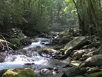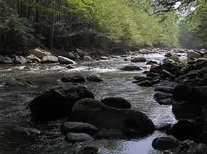 The upper watershed of the Middle Fork of the Little Pigeon River consists of a series of streams, some flowing down from Grapeyard Ridge to the west and a dozen or so flowing down from Greenbrier Pinnacle to the east. Each of these streams has cut a deep hollow, isolating the bottomlands of each amidst low ridges. Thus, rather than being one large community, Greenbrier consisted of several individual communities located along these streams. Most communities took the name of the stream upon which they were situated.[10] Along with Greenbrier Cove, the most prominent of these small communities included Copeland, Soak Ash, Webb Creek, Ramsey Creek, Noisy Creek, Redwine Creek, and Little Bird Branch, all at the base of Greenbrier Pinnacle, and Laurel Creek (now Rhododendron Creek), located on Grapeyard Ridge.