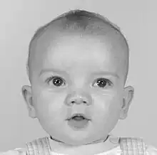 Patient with Greig cephalopolysyndactyly syndrome showing hypertelorism and macrocephaly.