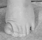 The foot of the patient with Greig cephalopolysyndactyly shows a partially duplicated hallux with cutaneous syndactyly of several digits.