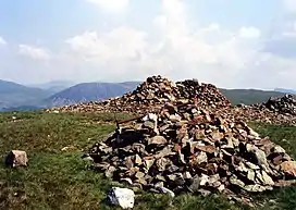 The top bears a massive stone cairn together with two smaller ones, built from the many specimens lying near the summit on an otherwise grassy dome. The main cairn gives the fell its alternative local name, Stone Man. A weather station is a rather more modern addition to the summit decorations.[1][2]