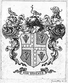 • "Per cross, or and az. a cross quarterly, erm. and of the first, betw. four pheons counterchanged, of the field. Crest, a pea-hen ppr. Motto, non degener." Robson, 1830