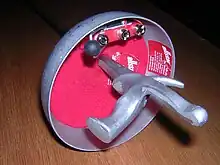 A pistol grip is any grip with a special shape or protrusion intended to aid in holding the weapon. To be legal a pistol grip must fix the hand in one position, and the fencer's thumb must fall within 2 cm of the bell guard when the weapon is gripped.[1]