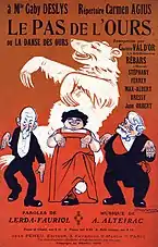 The Grizzly Bear is an early 20th-century dance style. It started in San Francisco, along with the Bunny Hug and Texas Tommy and was also done on the Staten Island ferry boats in the 1900s. It has been said that dancers John Jarrott and Louise Gruenning introduced this dance as well as the Turkey Trot at Ray Jones Café in Chicago, Illinois around 1909. The Grizzly Bear was first introduced to Broadway audiences in the Ziegfeld Follies of 1910 by Fanny Brice.[2]