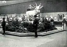 In 1927, the exhibition was run for the first time by the Kartell der vereinigten Verbände Bildender Künstler Berlin. The Cartel had been founded to do justice to the interests of all artists. The exhibition commission was composed of one representative each from various groups and associations, namely the Allgemeine deutsche Kunstgenossenschaft, Ortsverein Berlin (General German Art Cooperative, Berlin chapter), the architects' association Der Ring, the Berlin Secession, the international association of expressionists, futurists, cubists and constructivists Die Abstrakten, the Freie Vereinigung der Graphiker zu Berlin (Association of Graphics Artists of Berlin), the Künstlervereinigung Berliner Bildhauer (Artists' Association of Berlin Sculptors), the November Group, the Verein Berliner Künstler, the Verein der Berliner Künstlerinnen (Association of Berlin Women Artists) and the Frauen-Kunstverband (Women's Art Association). There was also a representative for the artists who did not belong to any of the cartel's associations.[22] The 1927 exhibition included a special exhibition of paintings by Kazimir Malevich. Since Malevich had to return to the Soviet Union early, he gave the pictures to Hugo Häring for safekeeping in his function as treasurer of the exhibition.[23] On the one hand, Malevich hoped for further sales, on the other for a return to Berlin. The pictures embarked on an "odyssey" and never returned to Russia. Of the 73 paintings exhibited, 18 works are now considered lost.