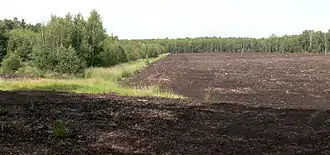 The Großes Moor (literally "Great Bog") near Gifhorn is part of the Northwest German raised bog region, which stretches from the Netherlands to the eastern border of Lower Saxony on the sandy areas (geest) left behind by the ice age. The moor has a total area of about 6,100 hectares (15,000 acres), of which around 5,000 hectares (12,000 acres) are raised bog and some 1,100 hectares (2,700 acres) are fen. The peat layer is up to almost 6 metres thick in places.[1] Individual parts of the moor have their own names like Stüder Moor, Hestenmoor or Weißes Moor.