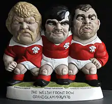 A Grogg is a caricature figure made by the World of Groggs, a ceramics company established by John Hughes in 1965, in Trefforest near Pontypridd, Wales. Most Groggs are 9 inches tall or less and are made of a type of clay called grog. Groggs are usually made of popular Welsh rugby players,[1] Welsh celebrities[2] and the occasional non-Welsh celebrity.[3][4] Whenever possible the person who is "grogged" is presented with the first Grogg produced.[5] They are moulded and painted by hand and a Grogg can take many weeks from the master copy being made to the first one being painted.