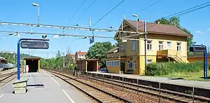 Grorud Station (Norwegian: Grorud stasjon) is a railway station on the Trunk Line located in the Grorud borough of Oslo, Norway. Situated 10.50 kilometers (6.52 mi) from Oslo Central Station, it consists of three tracks with a side platforms and an island platform. Grorud is served by the L1 line of the Oslo Commuter Rail.