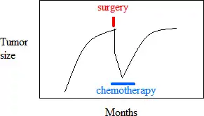 In the example shown in Figure 2, a tumor is found after the cell growth rate has slowed. Most of the cancer cells are removed by surgery. The remaining cancer cells begin to proliferate rapidly and cancer chemotherapy is started. Many tumor cells are killed by the chemotherapy, but eventually some cancer cells that are resistant to the chemotherapy drug begin to grow rapidly. The chemotherapy is no longer useful and is discontinued.
