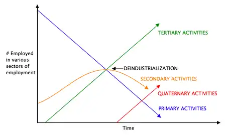 Peter Drucker has argued that there is a transition from an economy based on material goods to one based on knowledge.[22] Marc Porat distinguishes a primary (information goods and services that are directly used in the production, distribution or processing of information) and a secondary sector (information services produced for internal consumption by government and non-information firms) of the information economy.[23]