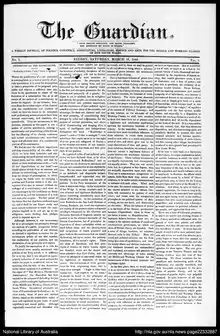 - 1 2 "The Guardian : a weekly journal of politics, commerce, agriculture, literature, science and arts for the middle and working classes of New South Wales Australian National Bibliographic Database Catalogue Record". Trove. National Library of Australia. Retrieved 1 November 2017.