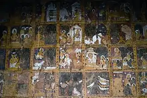 The Gubyaukgyi (alt. Kubyauk-gyi) temple, located just south of Bagan, Myanmar, in Myinkaba Village, is a Buddhist temple built in 1113 AD by Prince Yazakumar, shortly after the death of his father, King Kyansittha of the Pagan Dynasty.[1] The temple is notable for two reasons. First, it contains a large array of well-preserved frescoes on its interior walls, the oldest original paintings to be found in Bagan.[1] All of the frescoes are accompanied by ink captions written in Old Mon, providing one of the earliest examples of the language's use in Myanmar.[2] Second, the temple is located just to the west of the Myazedi Pagoda, at which was found two stone pillars with inscriptions written in four, ancient Southeast Asian languages: Pali, Old Mon, Old Burmese, and Pyu. The inscription on the pillar displayed by the Myazedi Pagoda has been called the Burmese Rosetta Stone,[2] given its significance both historically and linguistically, as a key to cracking the Pyu language.[3]
