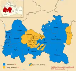 Wards won by Liberal Democrats – Friary and St Nicolas (3); Holy Trinity (2); Merrow and Burpham (3); Normandy (1); Onslow (3); Stoughton (3); Tongham (1); Worplesdon (3)