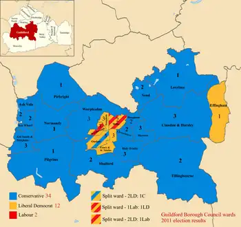 Wards electing councillors of more than one party – Burpham (2 – 1 Con, 1 LibD); Christchurch (2 – 1 Con, 1 LibD); Holy Trinity (3 – 1 Con, 2 LibD); Onslow (3 – 1 Con, 2 LibD); Tillingbourne (2 – 1 Con, 1 Ind)