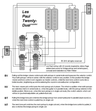 A diagram showing a wiring modification for a Les Paul or a similar electric guitar with two humbuckers. Wiring schemes using four push-pull pots for additional pickup combinations were made popular by Led Zeppelin guitarist Jimmy Page and later produced as a signature model by Gibson. The modification shown in this diagram is an evolution of the original concept combining coil splitting, phase cancellation and parallel/series switching for a total of 22 different pickup combinations.