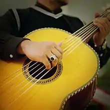 The guitarrón mexicano (Spanish for "big Mexican guitar", the suffix -ón being a Spanish augmentative) or Mexican guitarrón is a very large, deep-bodied Mexican six-string acoustic bass guitar played traditionally in Mariachi groups. Although similar to the guitar, it is not a derivative of that instrument, but was independently developed from the sixteenth-century Spanish bajo de uña ("fingernail[-plucked] bass"). Because its great size gives it volume, it does not require electric amplification for performances in small venues. The guitarrón is fretless with heavy gauge strings, most commonly nylon for the high three and wound metal for the low three. The guitarrón is usually played by doubling notes at the octave, a practice facilitated by the standard guitarrón tuning A1 D2 G2 C3 E3 A3. Unlike a guitar, the pitch of the guitarrón strings does not always rise as strings move directionally downward from the lowest-pitched string (the 6th string from the lowest-pitched string, A2, is a perfect 5th below the adjacent string E3).