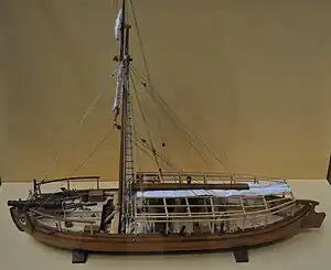 A gundalow (also known in period accounts as a "gondola") is a type of flat-bottomed sailing barge once common in Maine and New Hampshire rivers, United States. It first appeared in the mid-1600s, reached maturity of design in the 1700 and 1800s, and lingered into the early 1900s before nearly vanishing as a commercial watercraft.[1]