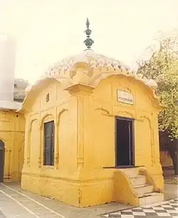 The shrine ("shaheedi asthan") is believed to be situated at the place where Bhai Taru Singh was executed in 1745 by Zakariya Khan when he had his head scalped rather than cutting his hair or converting to Islam.[23] According to Sikh sources, after cutting Bhai Taru Singh's scalp Zakaria Khan was stricken with unbearable pain and the inability to urinate.[24] As a last resort, Khan sent an apology to the Khalsa Panth for his persecution of Sikhs and begged for forgiveness. It was suggested that if Khan hit himself with Bhai Taru Singh's shoes his condition might be lifted. Although hitting himself with Bhai Taru Singh's shoe did cure the Khan's condition, he died 22 days later from having hit himself with the shoes, which is what Bhai Taru Singh had predicted. Upon hearing the death of Khan and that he had outlived the Khan, Taru Singh also died on 1 July 1745.[25]