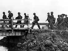 Marines cross a bridge in Agat during the liberation of Guam in 1944