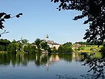 The monastery with its rococo church on a peninsula in Lake Höglwörth represents one of the finest ensembles in the eastern Upper Bavaria. The church was rebuilt from 1675. The choir was preserved from the Romanesque church.[2] Before silting to the east the monastery was on an island, but it is now on a peninsula.[3] Wörth is an old word for island, and it is still shown as an island on the field map from the 19th century.[4]
